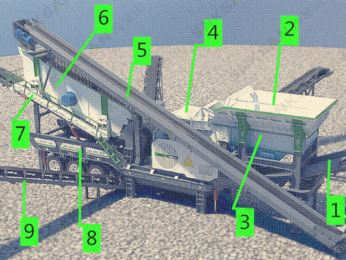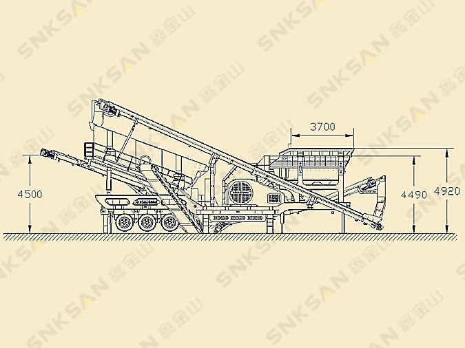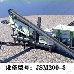 組成:主皮帶機、料倉、給料機、錘破、上料皮帶機、振動篩、篩下皮帶機、車架、外掛皮帶機