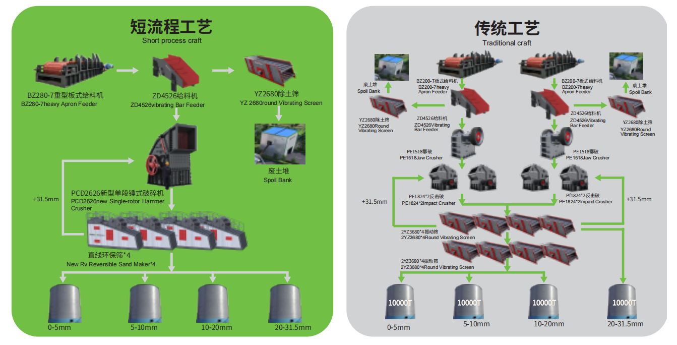 項(xiàng)目生產(chǎn)線采用鑫金山特有的高效節(jié)能短流程工藝,實(shí)現(xiàn)傳統(tǒng)多臺(tái)破碎機(jī)的產(chǎn)量,破碎比大,一次成型率高達(dá)80%的特性,生產(chǎn)工藝中無(wú)需配置回料破,進(jìn)一步節(jié)約了場(chǎng)地與能耗,大幅減少配套設(shè)備、土建、非標(biāo)、鋼構(gòu)、電氣等投入。同時(shí),揚(yáng)塵點(diǎn)與檢修點(diǎn)也相應(yīng)減少,降低了環(huán)保與檢修壓力。