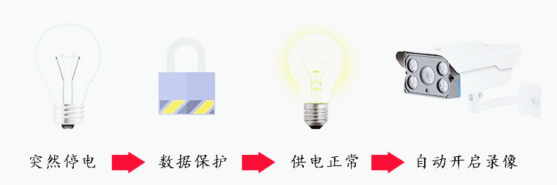 突然斷電,錄像機啟動數據保護功能,保證數據不丟失,供電正常后,自動開啟監控并錄像,無需手動開啟。